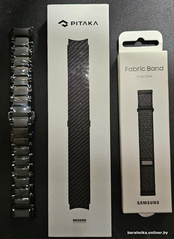 В подарок идут три ремешка: карбоновый оригинальный Pitaka, оригинальный новый Samsung Fabrik Band и керамический ремешок.