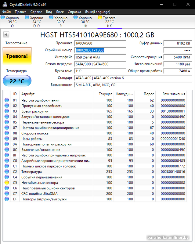 Жёсткий диск HGST 1tb 2.5" HTS541010A9E680. Есть нестабильные сектора.