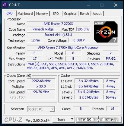 Процессор AMD Ryzen 7 2700X. Сокет AM4, 8 ядер, 16 потоков, частота 4.3/3.7 ГГц, кэш 4 МБ + 16 МБ, техпроцесс 12 нм, поддержка DDR4, TDP 105W.
