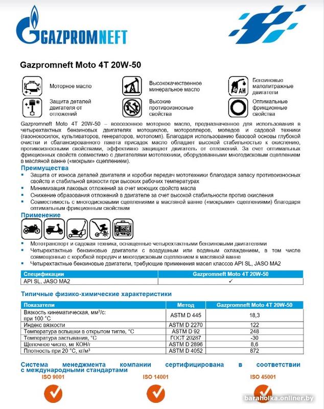 Gazpromneft Moto 4T 20W-50 – всесезонное моторное масло, предназначенное для использования в четырехтактных бензиновых двигателях мотоциклов, мотороллеров, мопедов и садовой техники (газонокосилок, культиваторов, генераторов, мотопомп, снегоуборщиков).