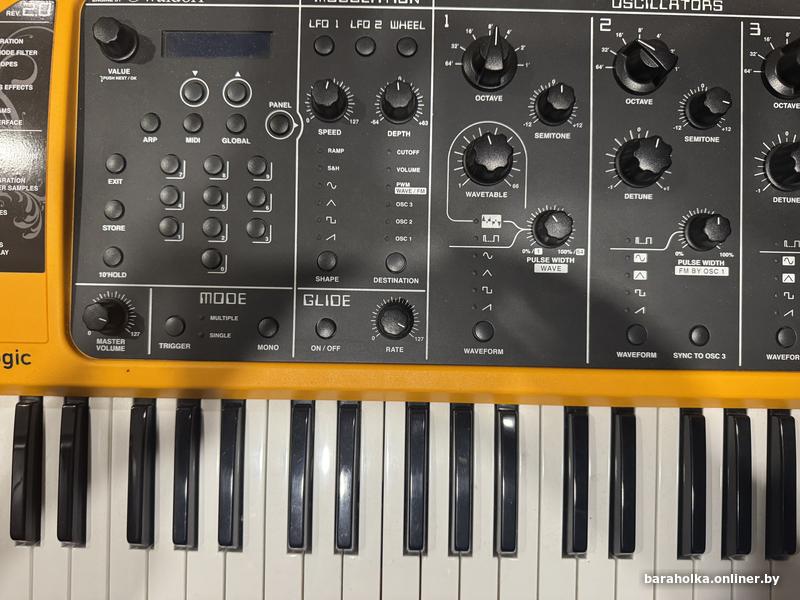 - Модуляция: LFO1, LFO2 (фазовая синхронизация), Wheel (Mod wheel и послекасание), регулировка скорости и интенсивности LFO, формы LFO: пилообразная, квадрат, треугольник, sine, sample и hold, ramp, направление: OSC1, OSC2, OSC3, PWM/Wav/FM, громкость, отсечка фильтра.