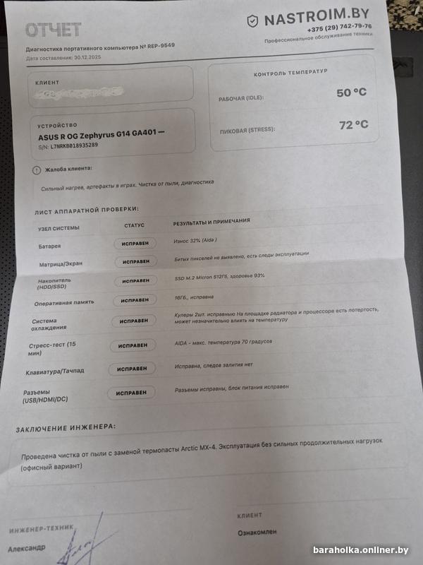 30.12.2025 проведена диагностики и чистка от пыли с заменой термопасты в мастерской. Отчет с диагностикой параметров прилагается.