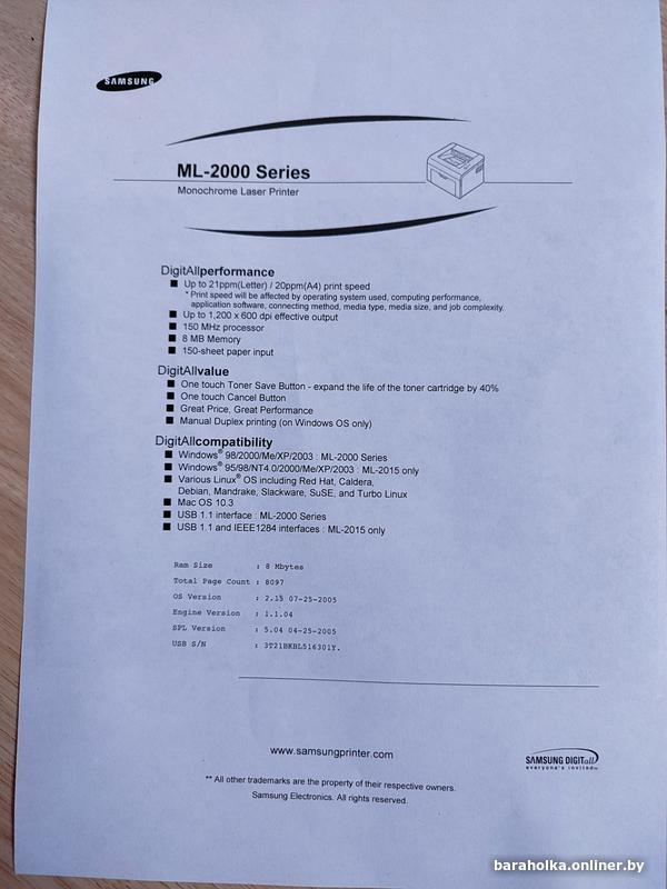 Принтер лазерный Samsung ML-2010. Хорошо печатает. Установлен новый картридж, с которым напечатано всего 5 листов. Шнуры прилагаются. Тел:80297582341