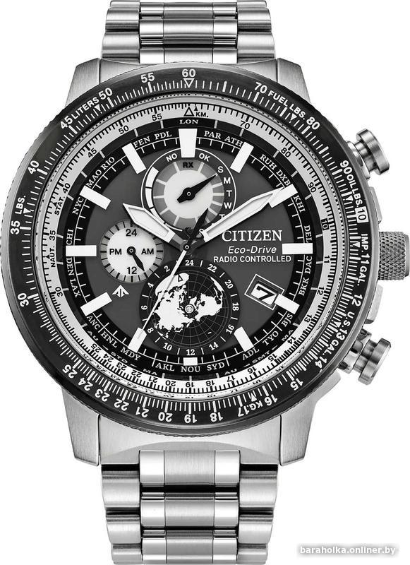 Калибр механизма Citizen H864. Запас хода при полной зарядке 180 дней. Функция предотвращения перезарядки. Индикатор запаса хода. Центральные часовая, минутная и секундная стрелки. Апертура даты в позиции 4 часов. Автоматическая настройка времени по радиосигналу (Германия, Япония, США, Китай). 12/24х часовой формат времени. Вечный календарь. Функция мирового времени (26 часовых зон). Логарифмическая линейка. Серный циферблат. Люминесцентные стрелки и метки. Круглый корпус выполнен из нержавеющей стали. Диаметр корпуса составляет 46 мм, толщина 11,5 мм. Заводная головка смещена в положение 4 часов. Стальной браслет, раскладывающаяся застежка. Устойчивое к возникновению царапин сапфировое стекло с антибликовым покрытием. Водостойкость WR 200 (погружение с аквалангом). Вес примерно 180 г. Лимитированная серия !!