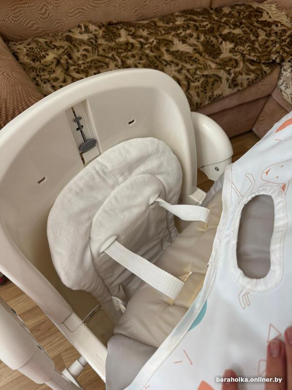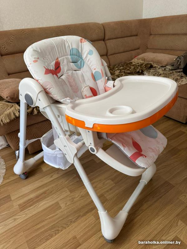 стульчик для кормления в идеальном состоянии, З положения спинки, 3 положения подставки для ног, регулируемый столик (можно при необходимости снять), 7 положений регулировки по высоте, 5-ти точечные ремни безопасности, дополнительный мягкий матрасик, 4 поворотных колеса с тормозным механизмом, корзина для мелочей, быстрая сборка для вертикального хранения.