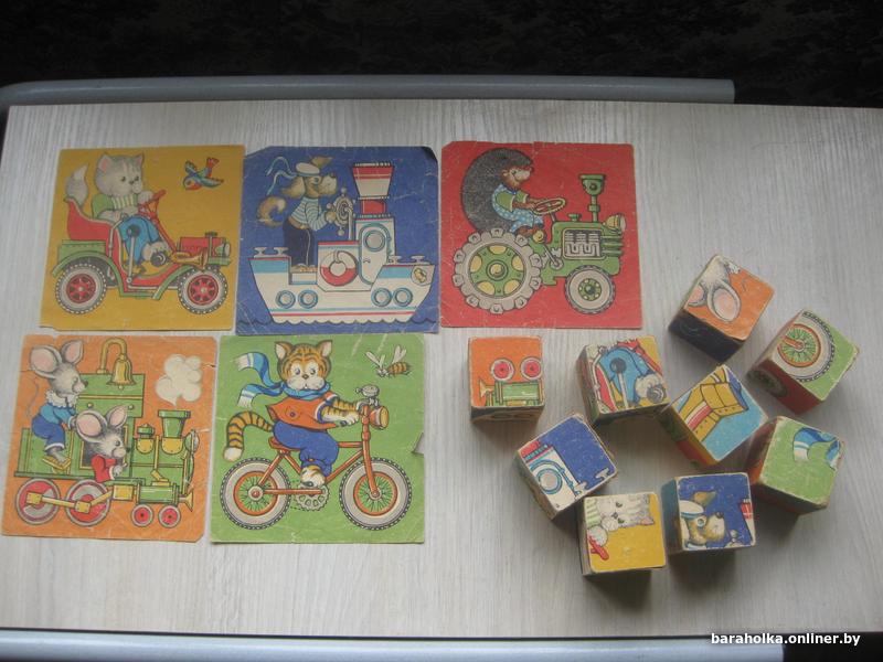 - деревянные кубики СССР , 1983 год, сторона кубика 4 см. Упаковочная коробка не сохранилась, на одном кубике картинка на одной грани оторвалась и потерялась, потерялась и одна картинка для сборки (всего было 6).