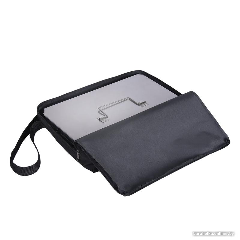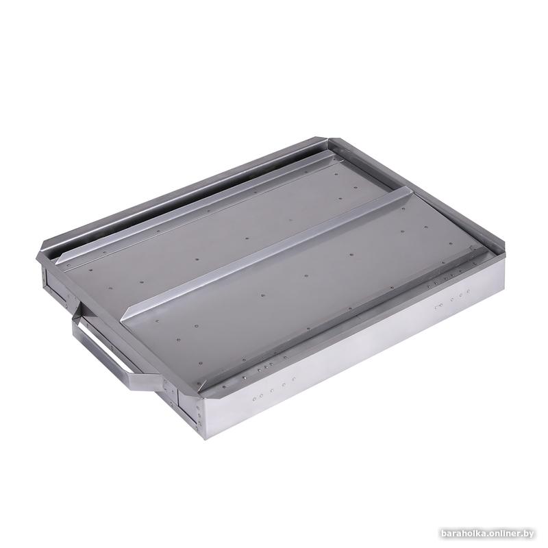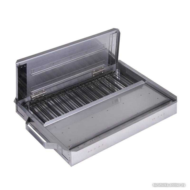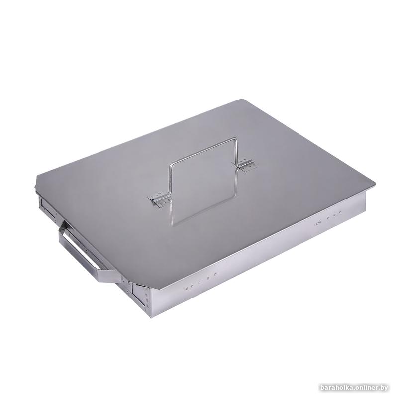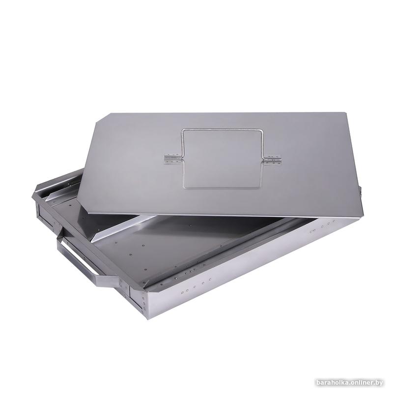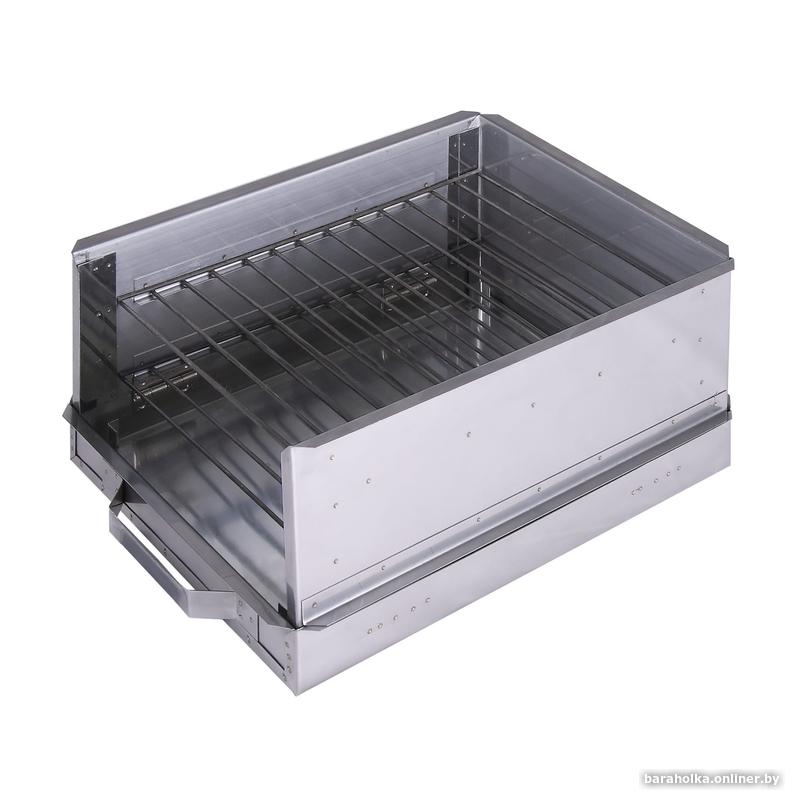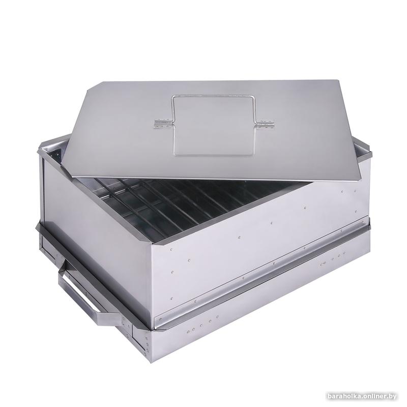 Коптильня состоит из металлического короба с шарнирно закрепленными боковыми и съемными торцевыми стенками, снабжена слайдерной крышкой с замком, поддоном для сбора жира и решетками для размещения пищевых продуктов. Все компоненты выполнены из жаропрочной нержавеющей стали. Комплектуется оригинальной сумкой с длинной ручкой