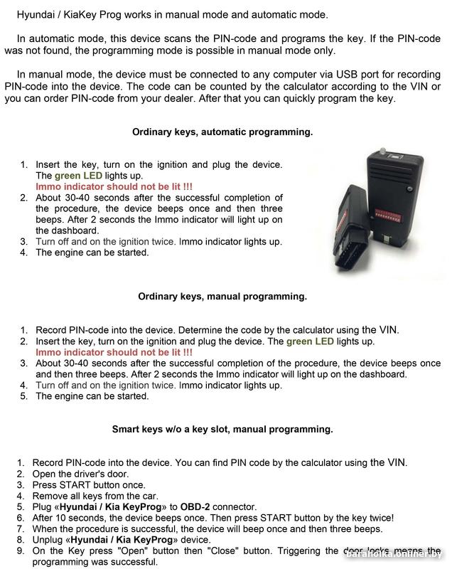 В ручном режиме программатор через USB можно подключить к ПК и записать оттуда PINкод. Код можно пересчитать калькулятором по VINкоду или заказать через дилера. После этого можно запрограммировать ключ ;