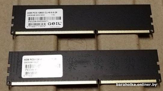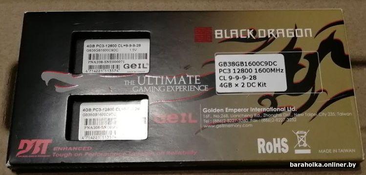 Продаю одним лотом набор оперативной памяти DDR3 Geil Black Dragon 2х4 (8 Gb) kit PC3 12800 1600 MHz CL 9-9-9-28. Б/у в оригинальной упаковке.