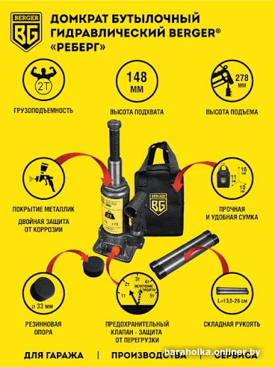• Бутылочный домкрат BERGER Реберг 2т 148-278мм . Новый, в использовании не был. Без торгаМогилев