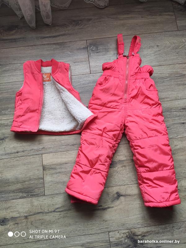Очень теплый, толстый зимний комбинезон и жилеточка на овчинке. Состояние вещей идеальное. На рост 92. Почтой высылаю.