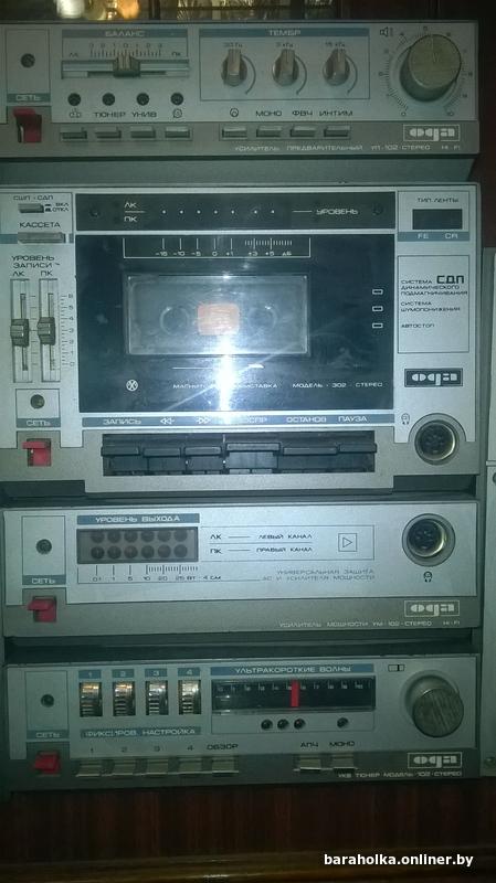"Ода-102-стерео" , комплект : тюнер , предварительный усилитель с коммутатором входов , усилитель мощности , магнитофон-приставка , колонки .