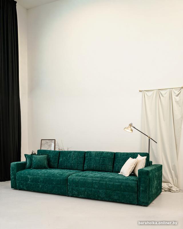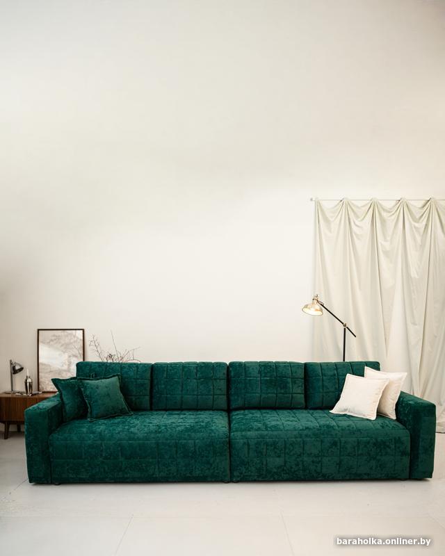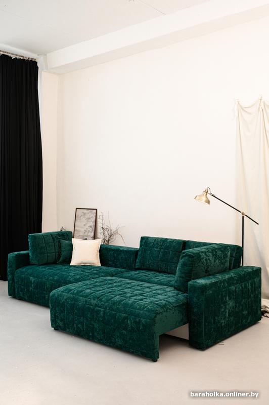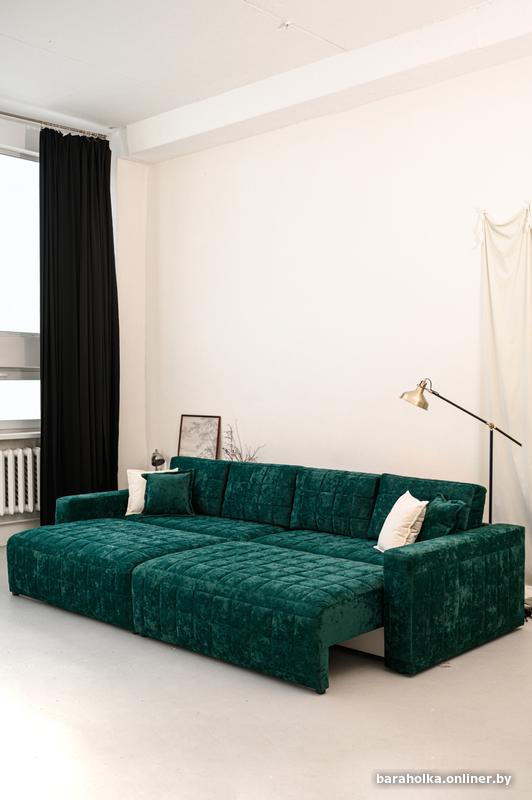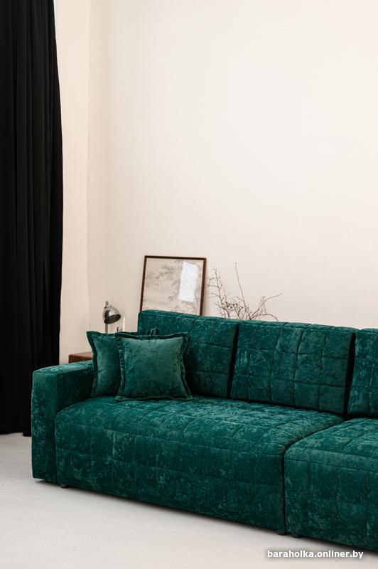 Диван выполнен в антивандальном изумрудном велюре — плотном, приятном на ощупь, устойчивом к истиранию и идеально подходящем для активной семьи.