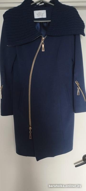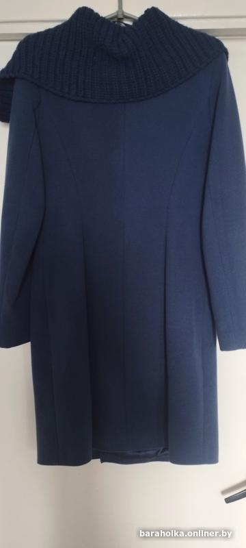 Пальто с асимметричной молнией и вязаным воротником от Tiara в отличном состоянии, весна-осень, воротник вязаный, есть пояс, молния золотистая. Цвет синий. Размер ориентировочно на 44, длина по спинке 90 см, рукав - 62 см. Цена 50 рублей.