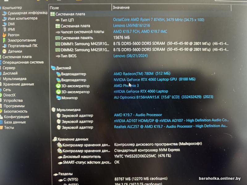 Процессор: AMD Ryzen 7 8745H, 3800 МГц, 8 ядер