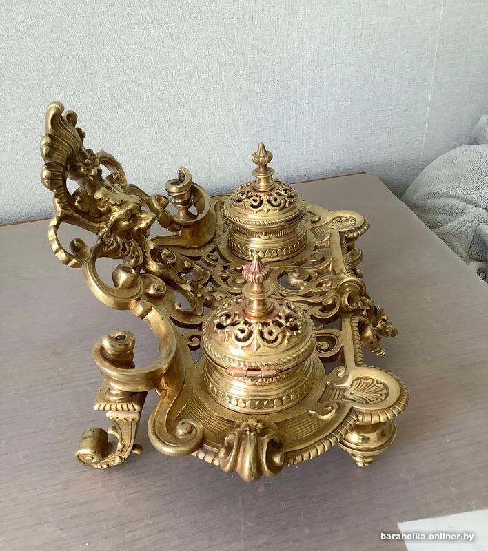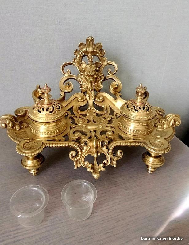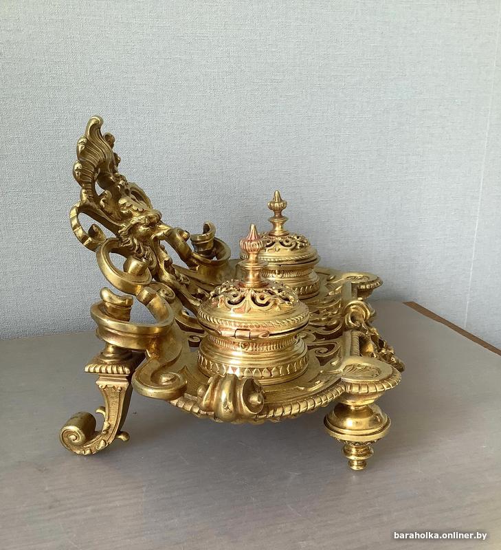 Бронзовая чернильница с двумя стекляными сосудами для чернил выполнена в стиле характерном для 19 века. Судя по ее декоративным элементам, она относится к середине 19 века, когда в Европе был популярен стиль рококо и классицизм. В это время бронзовые письменные приборы переживали пик популярности, часто становясь произведением исскуства благодаря ручной доработке и сложной технике чеканки.