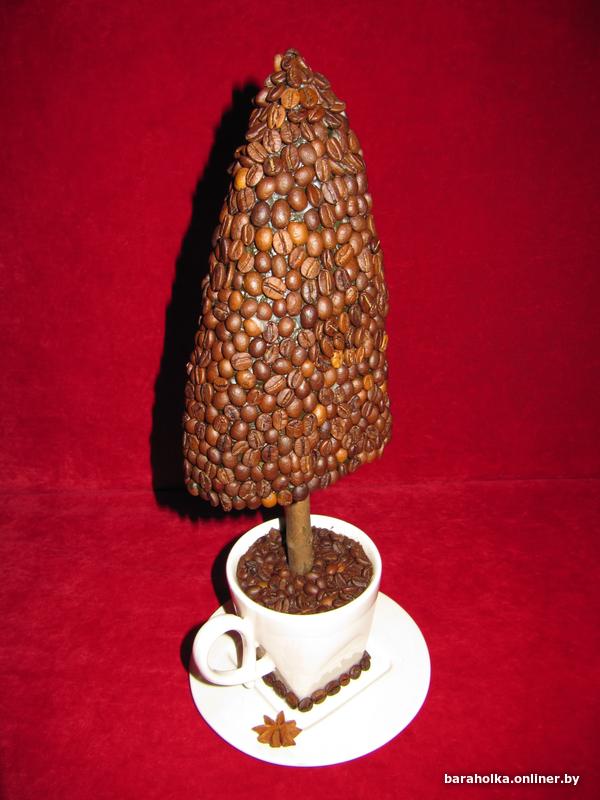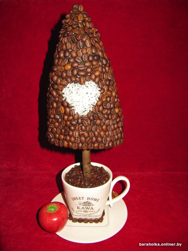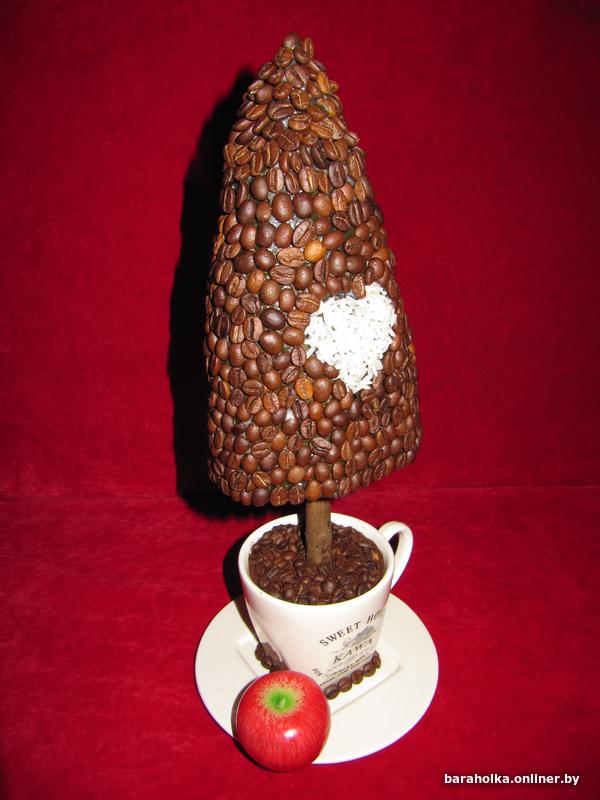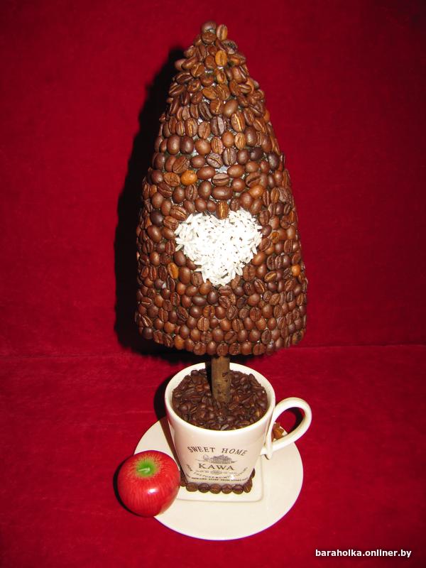 Топиарий ручной работы «Ёлка кофейная», высота 38 см. Топиарий выполнен из натуральных кофейных зёрен, дополнительно декорирован рисовым сердцем, звёздочкой бадьяна и аромо-свечой в виде яблока.