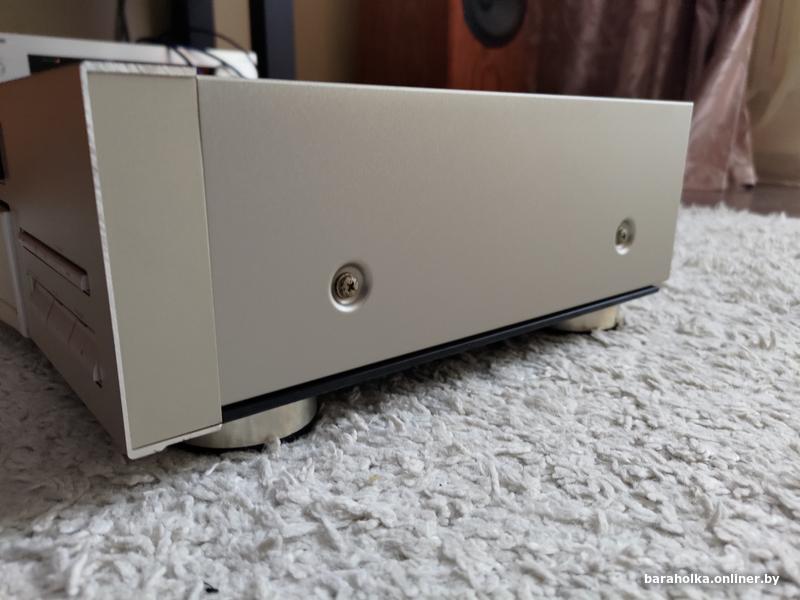 Aппарат принадлежит к топовой линейке плееров, и это видно с первого взгляда! Алюминиевая передняя панель, центральное расположение транспортного механизма, сотовое антивибрационное основание из материала ВМС (Вulk Моulding Соmроund), и нарядный золотистый цвет.