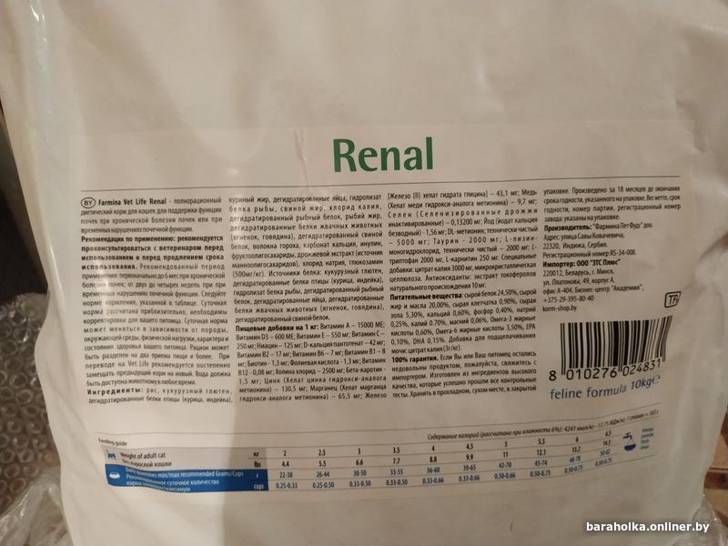 Продается Фармина Ренал, диетический, для профилактики хпн (почечной недостаточности). Покупался у официального дилера в Беларуси. В наличии 1 пакет 10 кг, срок годности большой до 03/ 2027 года