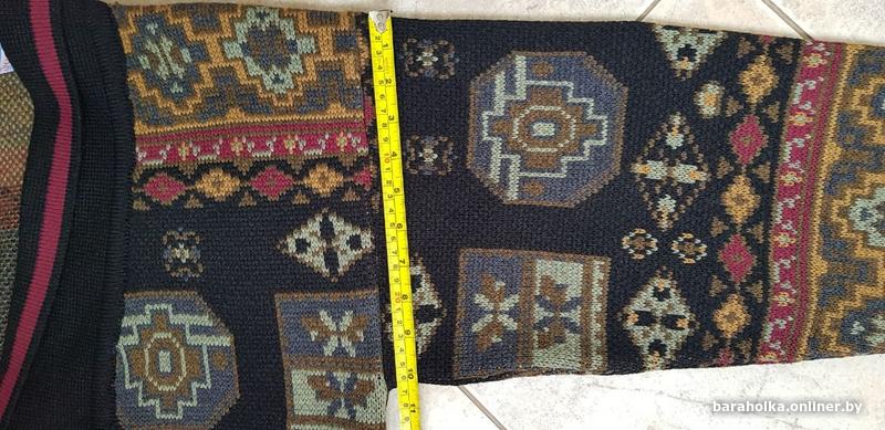Сложный геометрический / этнический принт с элементами черного, красного, зеленого и золотистого/ охристого цветов. Выглядит очень атмосферно, в духе старой школы. Отлично подойдет на каждый день, для зимних прогулок, фотосессий или тематических вечеринок.