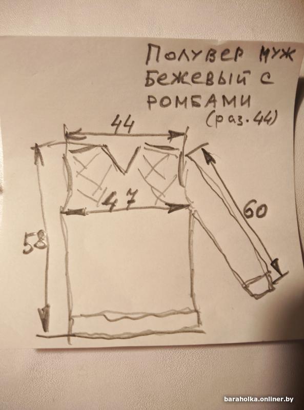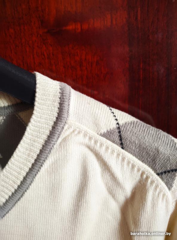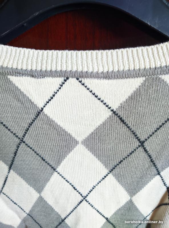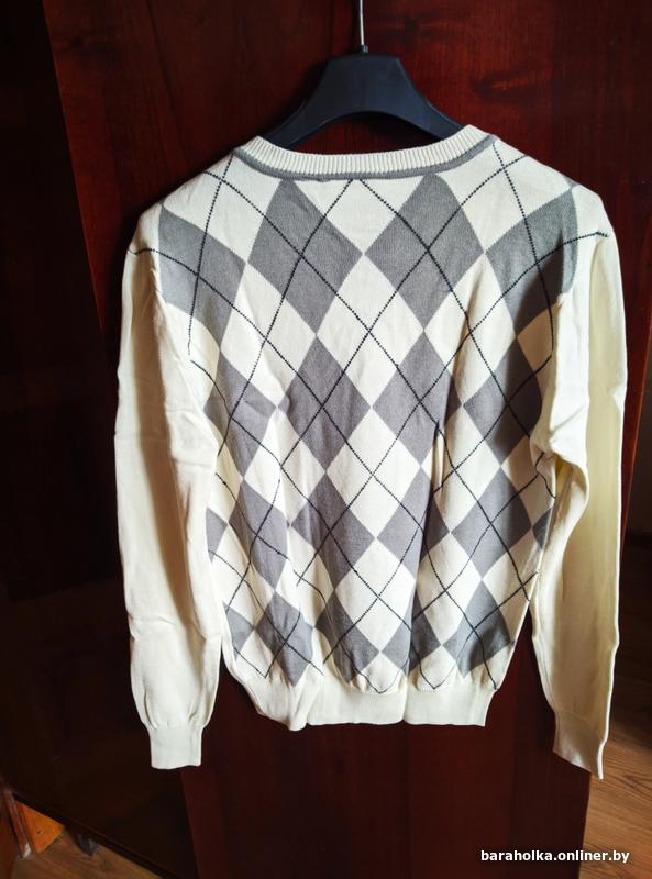 Приятного бежевого цвета, сзади графические "ромбы" контрастной расцветки (серого цчета), горловина "V"- формы.