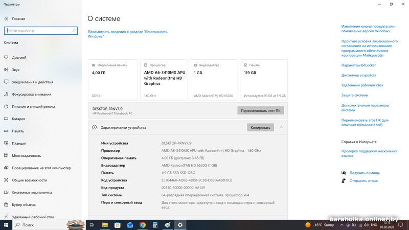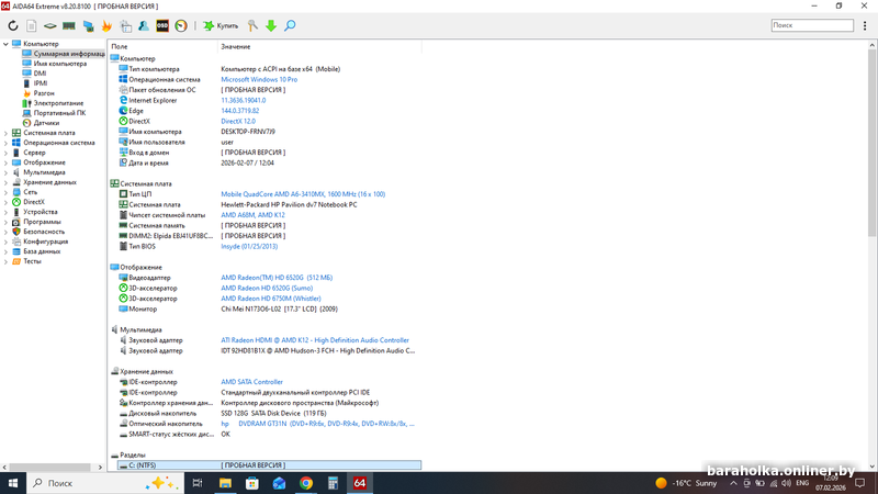 Процессор: 4-ядерный AMD A6-3410MX (1.6 ГГц)