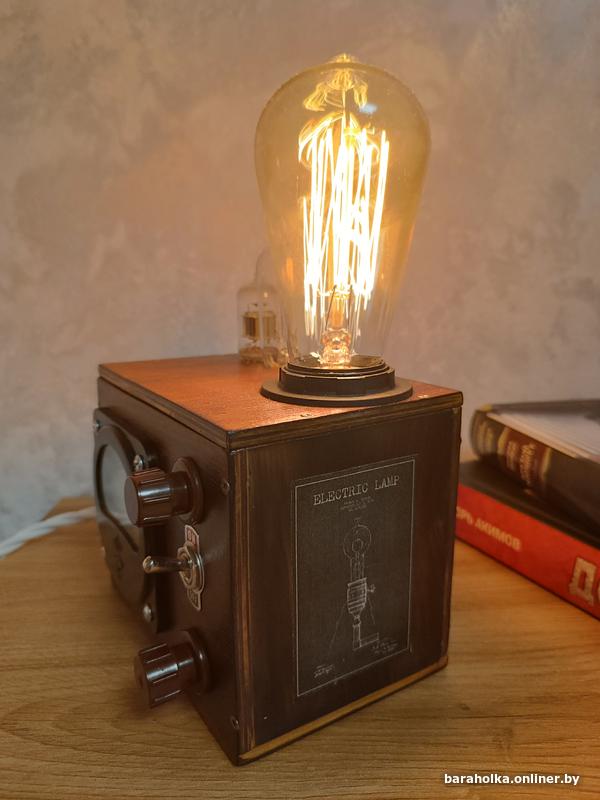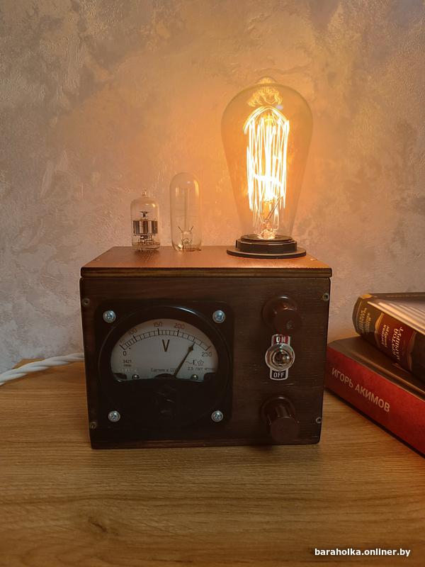 Светильник hand made в ретро стиле. Для освещения используется лампа Эдисона, создающая неповторимую атмосферу тепла и уюта. Идеально впишется в любой интерьер. Включается светильник с помощью тумблера установленного на передней части корпуса, при этом вольтметр показывает напряжение сети.