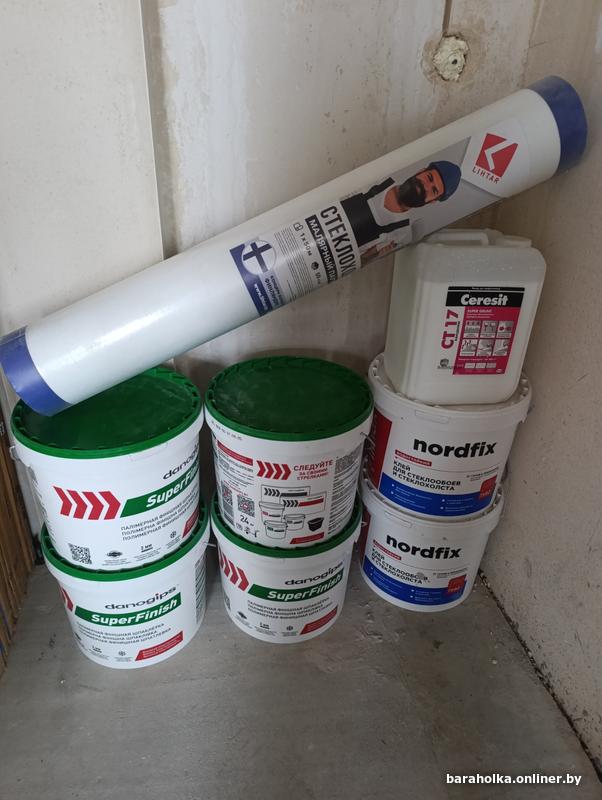 финишная шпатлёвка , 4 ведра по 24 кг ,паутина 1 шт 50 кв м 50 толщина , клей 2 ведра , ст 17 - 1 шт - 10 л
