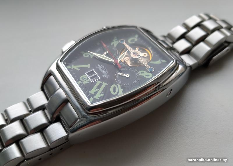 Циферблат: Черного цвета с открытым балансом («open heart»), через который видна работа механизма.