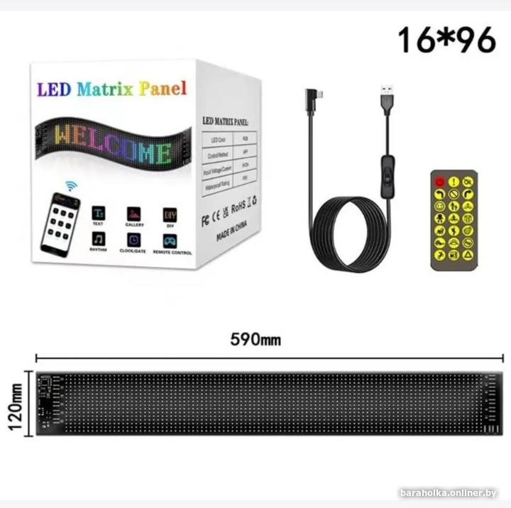 Светодиодная вывеска Полноцветный Led дисплей 96*16точек программируется с телефона.