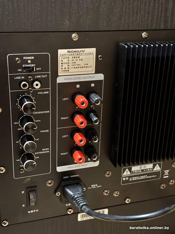 Регулировки: На панели расположены поворотные регуляторы для настройки громкости (Volume), частоты кроссовера (Crossover), фазы (Phase) и расширения баса (Bass Extension).