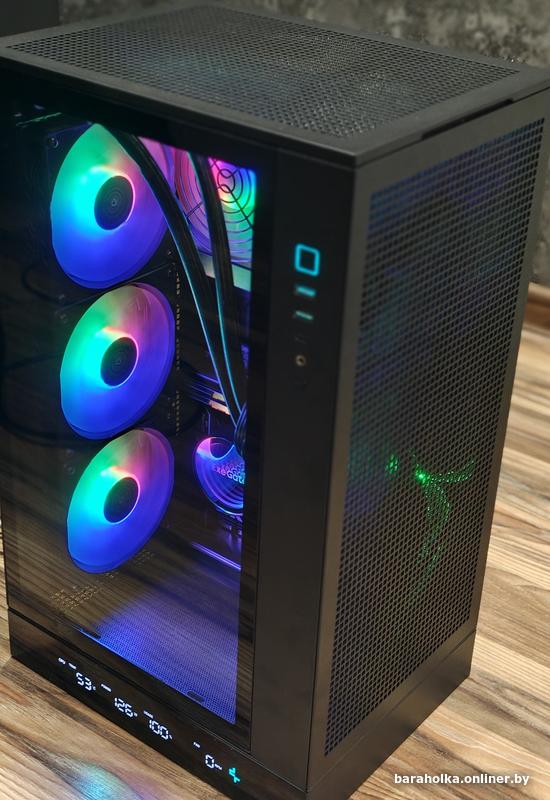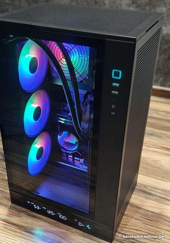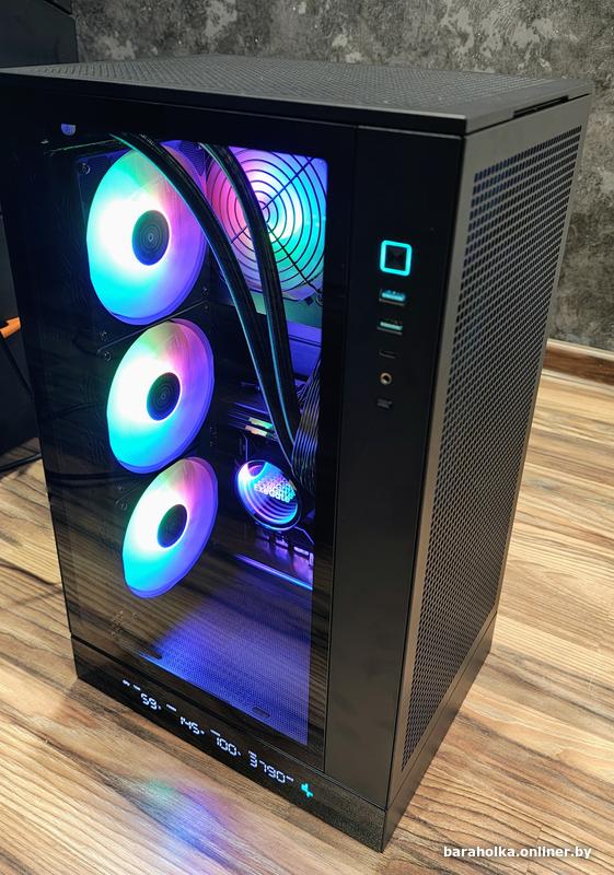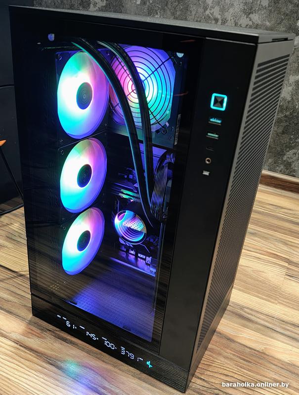 корпусе с экраном, выводящим статистику ПК. Комплектующие размещены перпендикулярно обычному расположению. Все провода уходят в низ - есть возможность сделать стоящий ПК на столе без видимых проводов!