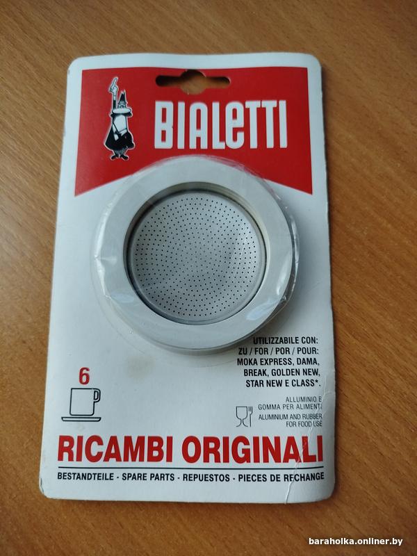 Новый набор уплотнительных колец + сито для гейзерных кофеварок Bialetti на 6 чашек, оригинал Италия. Внешний диаметр колец ~7.2см, модели к которым подходит указаны на упаковке на первом фото.