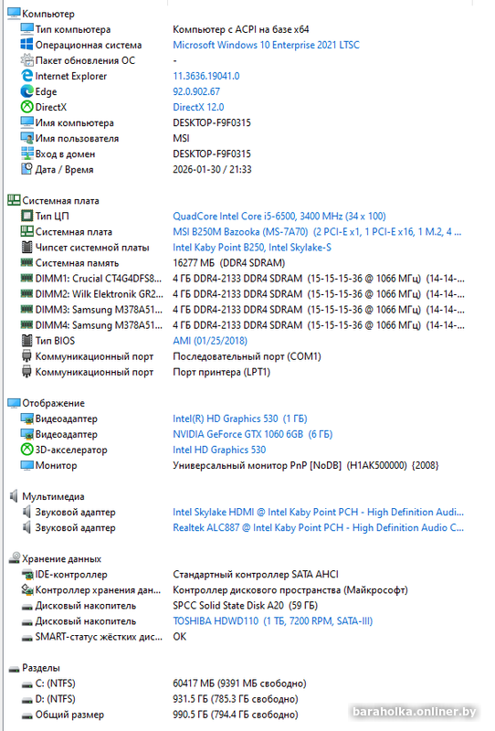 • накопитель SSD 64Gb + HDD TOSHIBA 1000Gb SATA-3