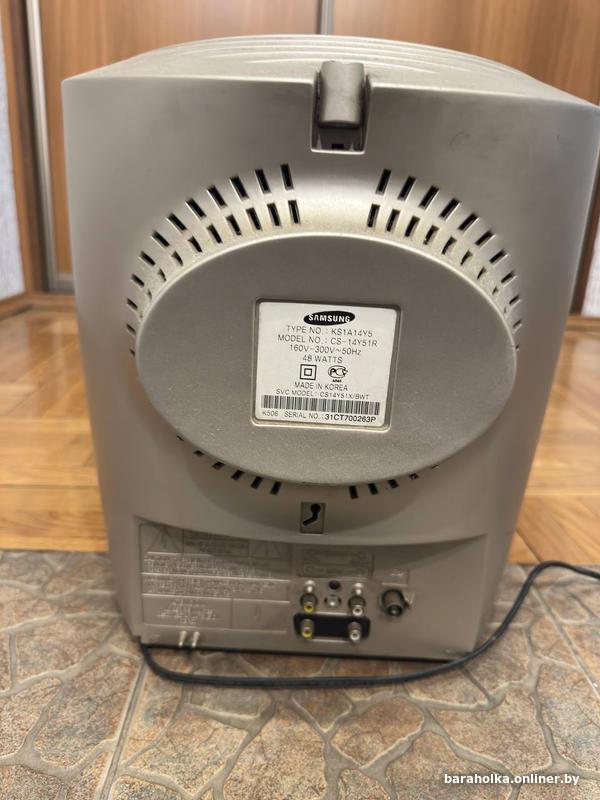 Телевизор Samsung с маркировкой TYPE NO. KS1A14Y5 соответствует модели CS-14Y51R — это компактный ЭЛТ (кинескопный) телевизор с диагональю 14 дюймов, выпущенный в начале 2000-х годов. Модель отличается надежностью, питается от сети 160V-300V, потребляет 48 Вт и предназначена для аналогового вещания.