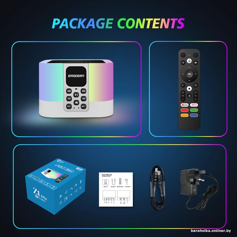 Приставка Android TV бокс EMODERN Z1 Mix - это качественное устройство 2 в 1, которое расширит функциональные возможности Вашего телевизора, а так же добавит управление голосом с помощью пульта. Яркая подсветка корпуса и встроенная Bluetooth колонка (работают независимо друг от друга) добавит изюминку и удобство пользования.