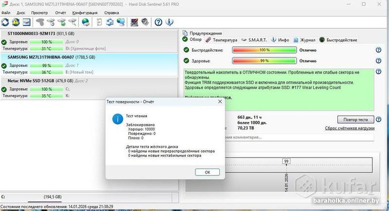 За все время использования перезаписано 70 TB при заявленном ресурсе диска в 10512 TBW. Причина продажи: замена на такой же диск большего объема.