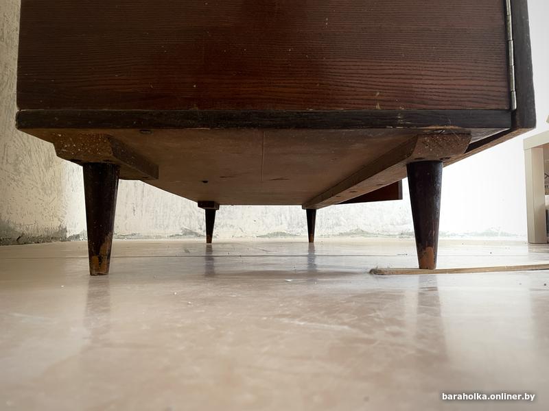 Шкаф стоит на 4-х деревянных ножках, возможно хранение вещей наверху: например, декоративных чемоданов, статуэток, декоративного беспорядка