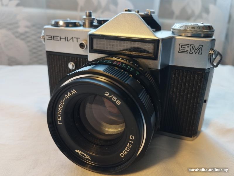 Зенит ЕМ (рабочий,в видоискателе фокус наводится) + объектив Гелиос 44м, 2/58 (в идеале, без царапин и сколов)