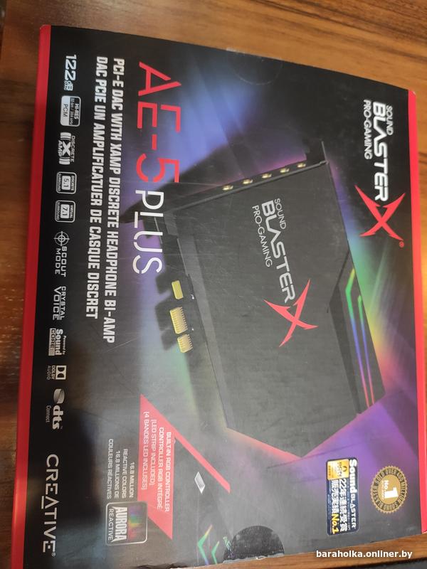 Продам новую внутреннюю звуковую карту Creative SB AE-5 Plus: PCIe, звук 7.1, ЦАП ESS ES9016K2M Sabre Ultra, Dolby Digital Live, DTS, PCM, 384 кГц, 32 бит, 122 дБ, оптический выход. Раздельно по-канальный усилитель XAMP для наушников, RGB-подсветка на самой карте плюс дополнительная светодиодная лента, доппитание для подсветки MOLEX, новое ПО Creative SBX с массой настроек для звука и эквалайзер. На белоруской гарантии 12 месяцев с даты продажи 11.03.2026г.
