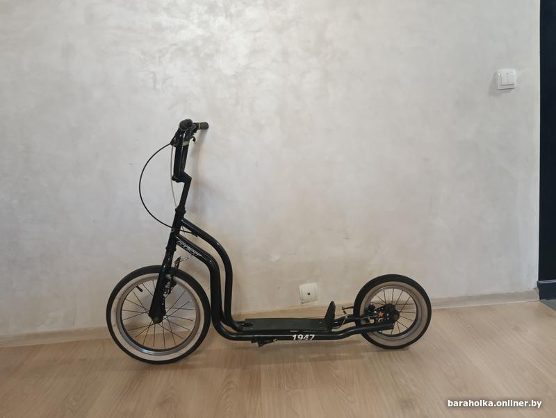 Самокат с надувными колесами 40 см переднее колесо и 30 см заднее. Тормоза на оба колеса, подножка. Езда мягкая даже на не ровной поверхности.