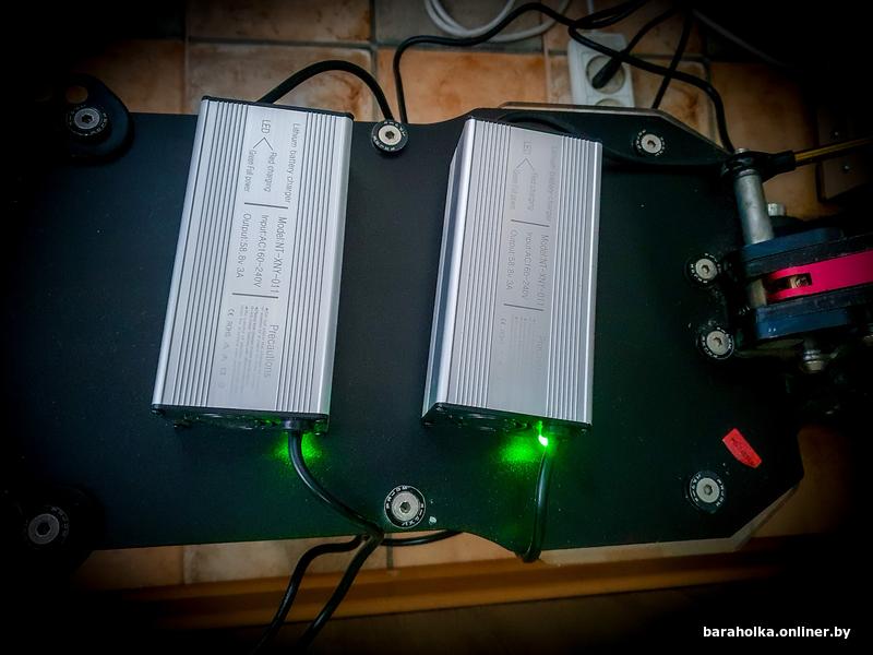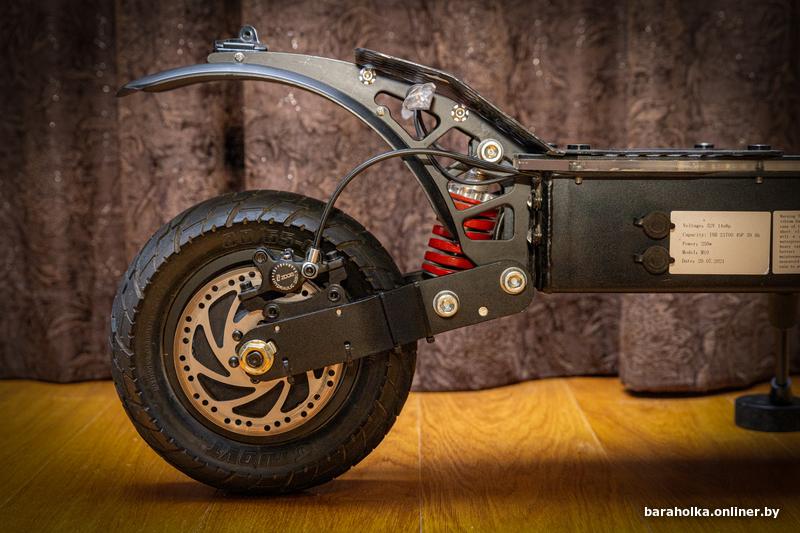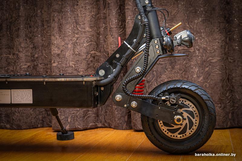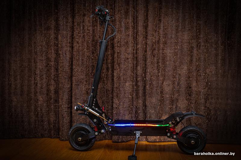 Мощные синусные контроллеры по 28A. Два 10-дюймовых 1200W мотор-колеса с сумарной пиковой мощностью 3000W. Аккумулятор 39 ah (пробег на одном заряде 80 км, скорость до 65 км/ч). Вес 37 кг. Два умных зарядных устройства 3А, 58,8V. Рулевой демпфер в комплекте (безопасность на высокой скорости). Сиденье в комплекте (на фото не показано). Для ГАИ на шильде заявлена мощность моторов 2х250W.