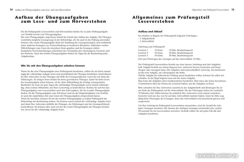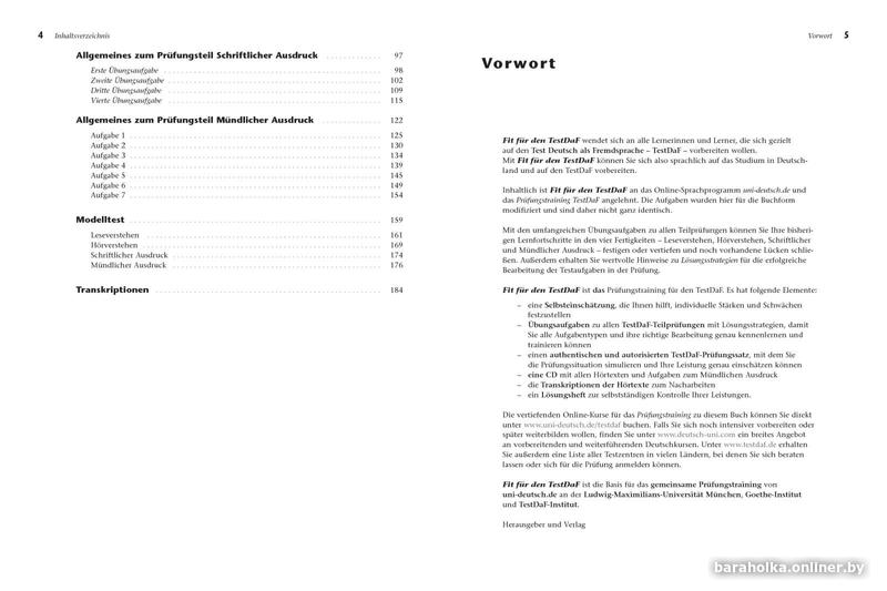 Также пособие содержит расшифровки аудиотекстов и ответы к заданиям (Lösungen) для самоконтроля в виде отдельной брошюры, что делает пособие пригодным как для использования на подготовительных курсах, при работе с преподавателем/репетитором, так и для самостоятельного обучения.