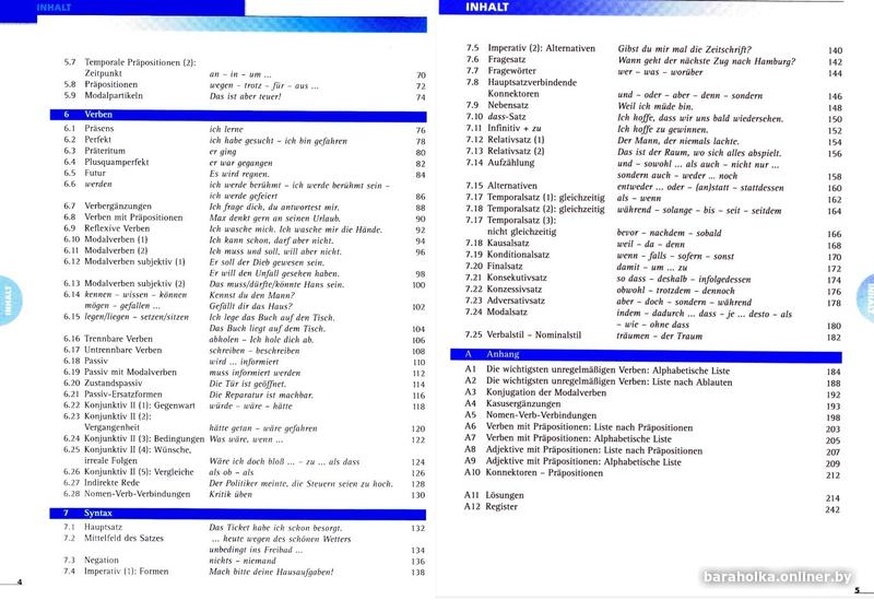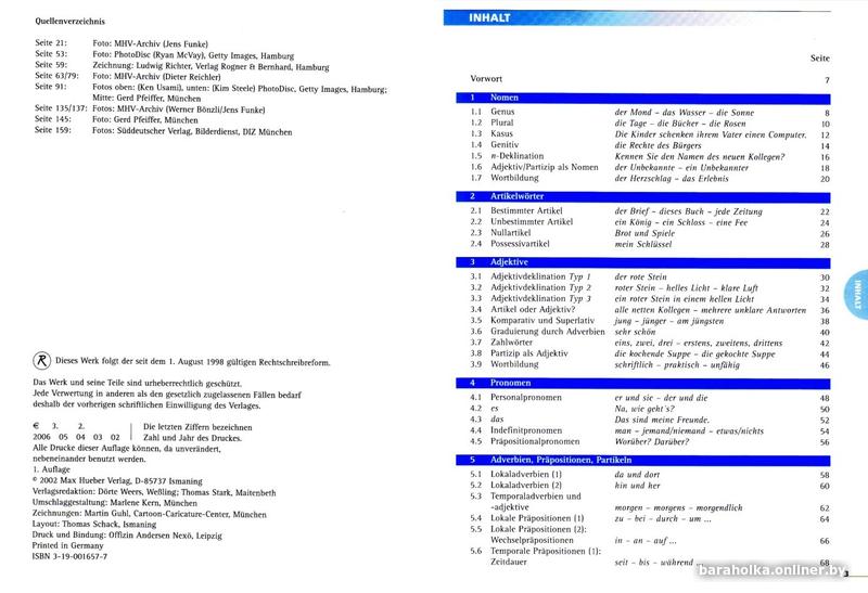 Оглавление чёткое и исчерпывающее (1 Существительные; 2 Артикли; 3 Прилагательные; 4 Местоимения; 5 Наречия, предлоги, частицы; 6 Глаголы; 7 Синтаксис; Приложение) с подразделами, посвященными конкретным грамматическим структурам (например, 1 Существительные - 1.1 Род, 1.2 Многоязычные...). Импонирует то, что соответствующие структуры иллюстрируются примерами в оглавлении; не нужно знать (иногда практически непроизносимый) технический термин, можно ориентироваться, используя примеры.