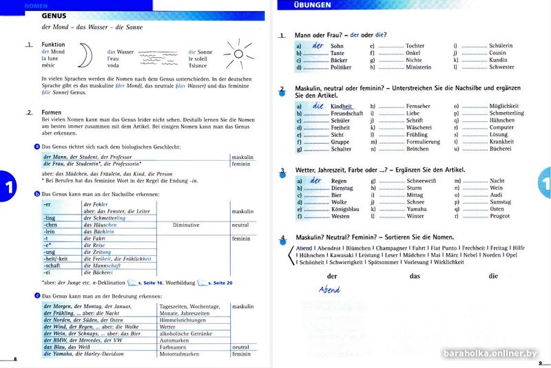 • Каждый раздел структурирован как разворот: на левой «странице с изложением» кратко изложены структуры (функция, формы, альтернативы; иллюстрировано наглядными таблицами и цветными блоками для быстрого ознакомления) и правила соответствующего явления, всегда с учётом основных трудностей и источников ошибок для учащихся. Грамматические объяснения представлены чётко и просто, без излишнего жаргона, который может сбить с толку и затруднить понимание для начинающих. Справа находится «страница для практики» с широким спектром соответствующих упражнений по теме, сложность которых варьируется от лёгкой до сложной.