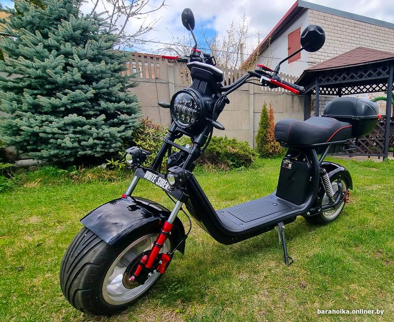 Мощность мотора 3950 Ватт. Максимальная скорость 65-70км/ч. Запас хода 50 км. Есть спинка, если снимать кофр, оригинальная фара и тормозной диск, родные аммортизаторы, зарядное и комплект ключей для сборки. Есть новый шлем (отдельно недорого). Езжу в основном на машине, не хватает времени покататься.